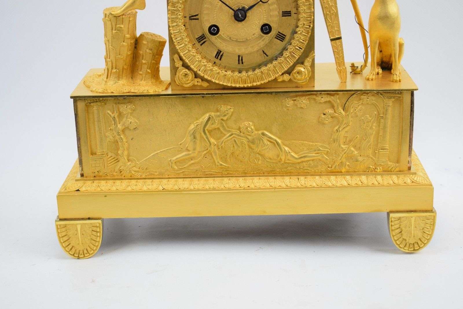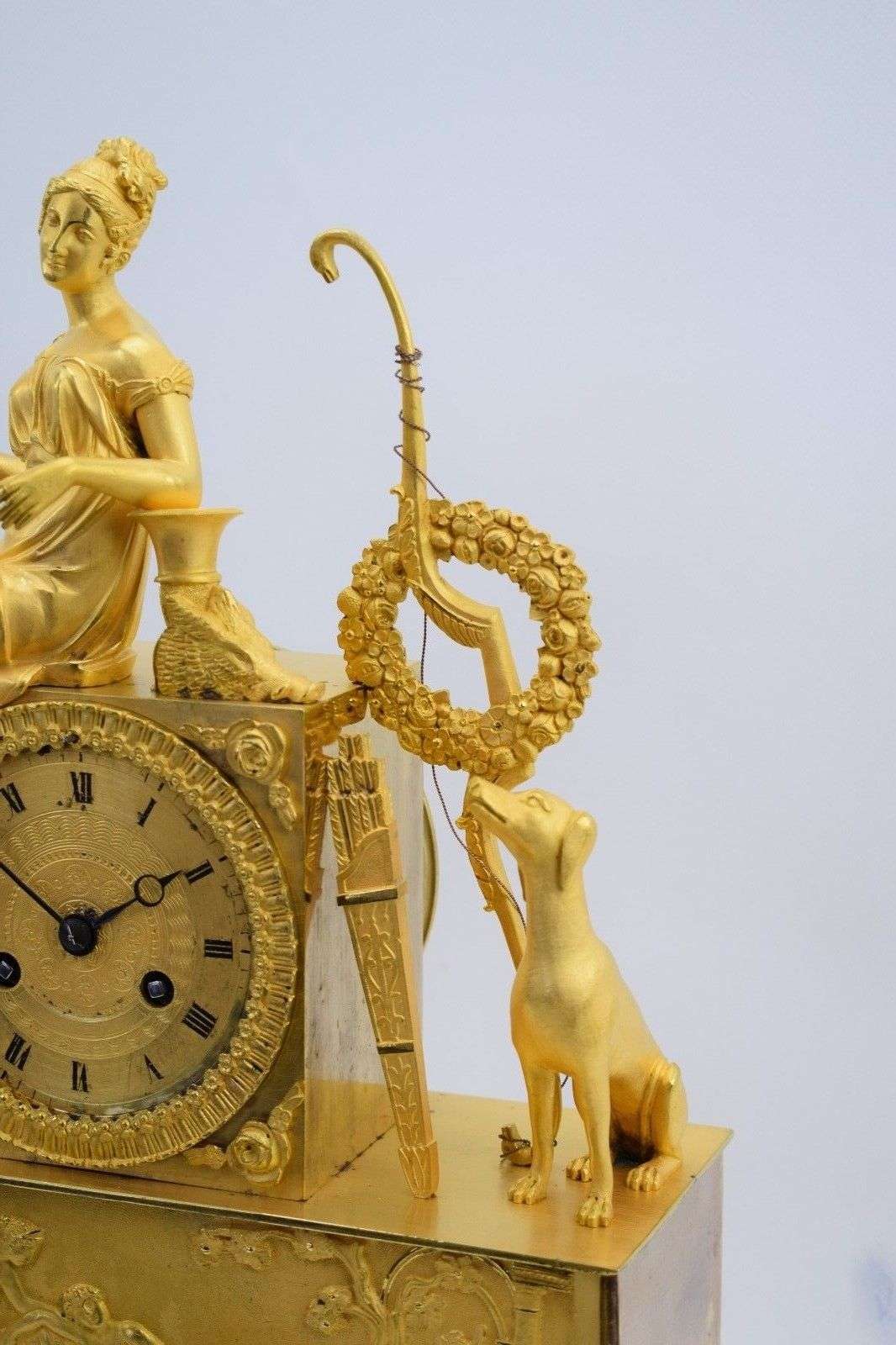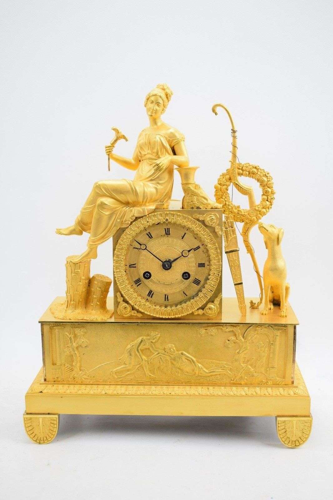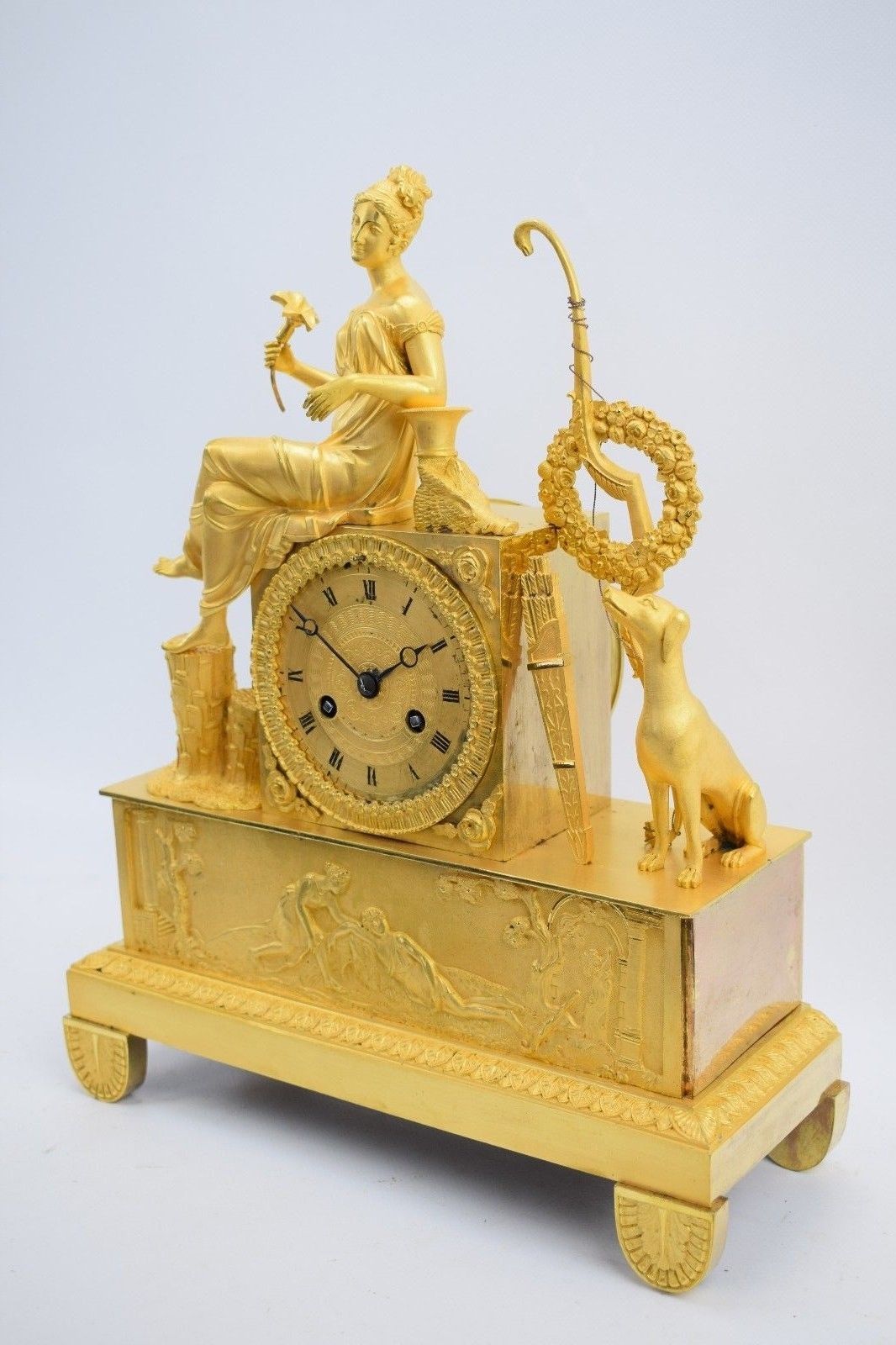 The case is carried by 4 feet, the front are decorated with palmettes, the square base with an allegorical depiction of Atermis and Endymion? is built on top of it, the clockwork with Artemis on it, next to it a bow, quiver and a hunting dog.