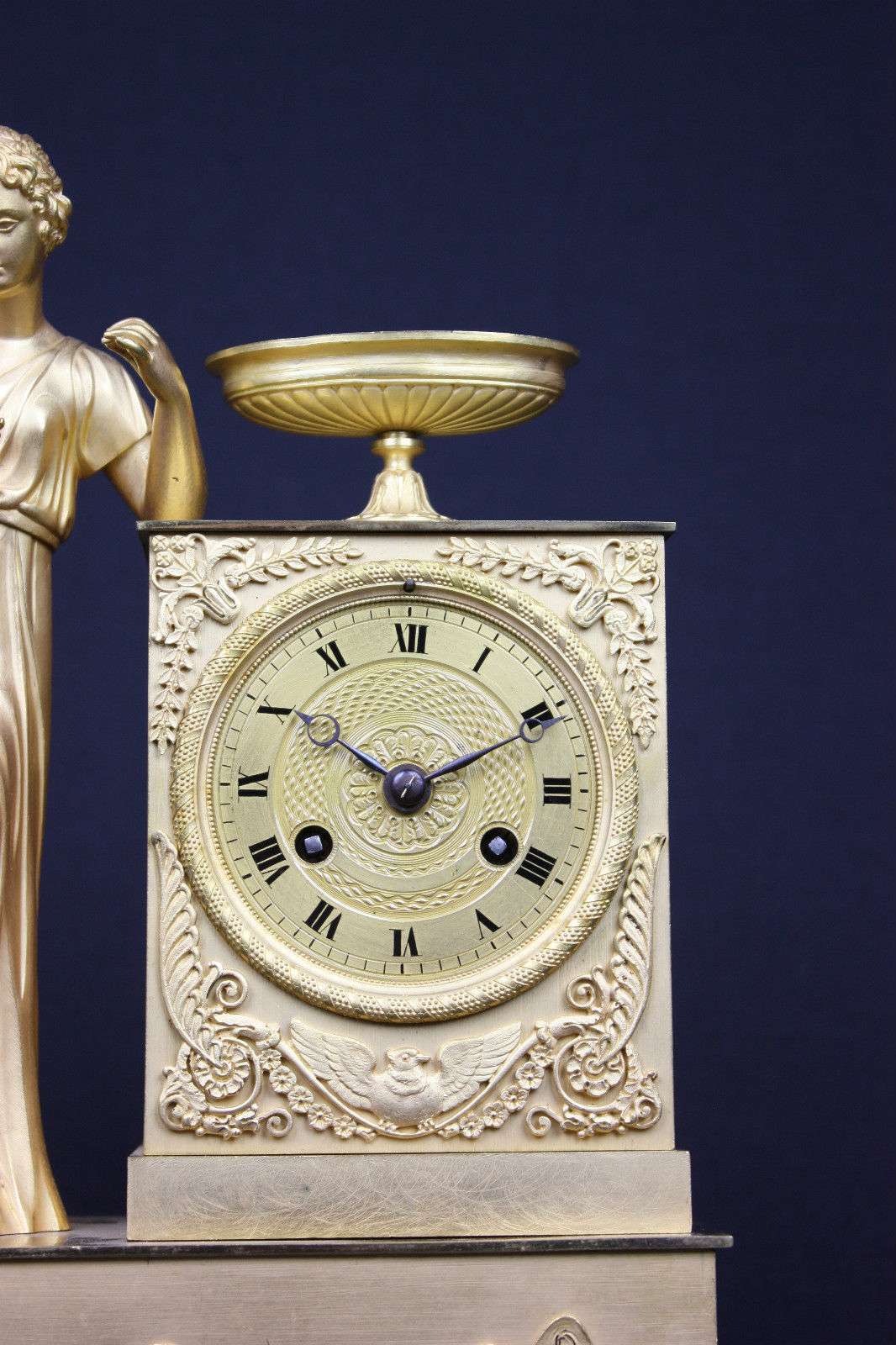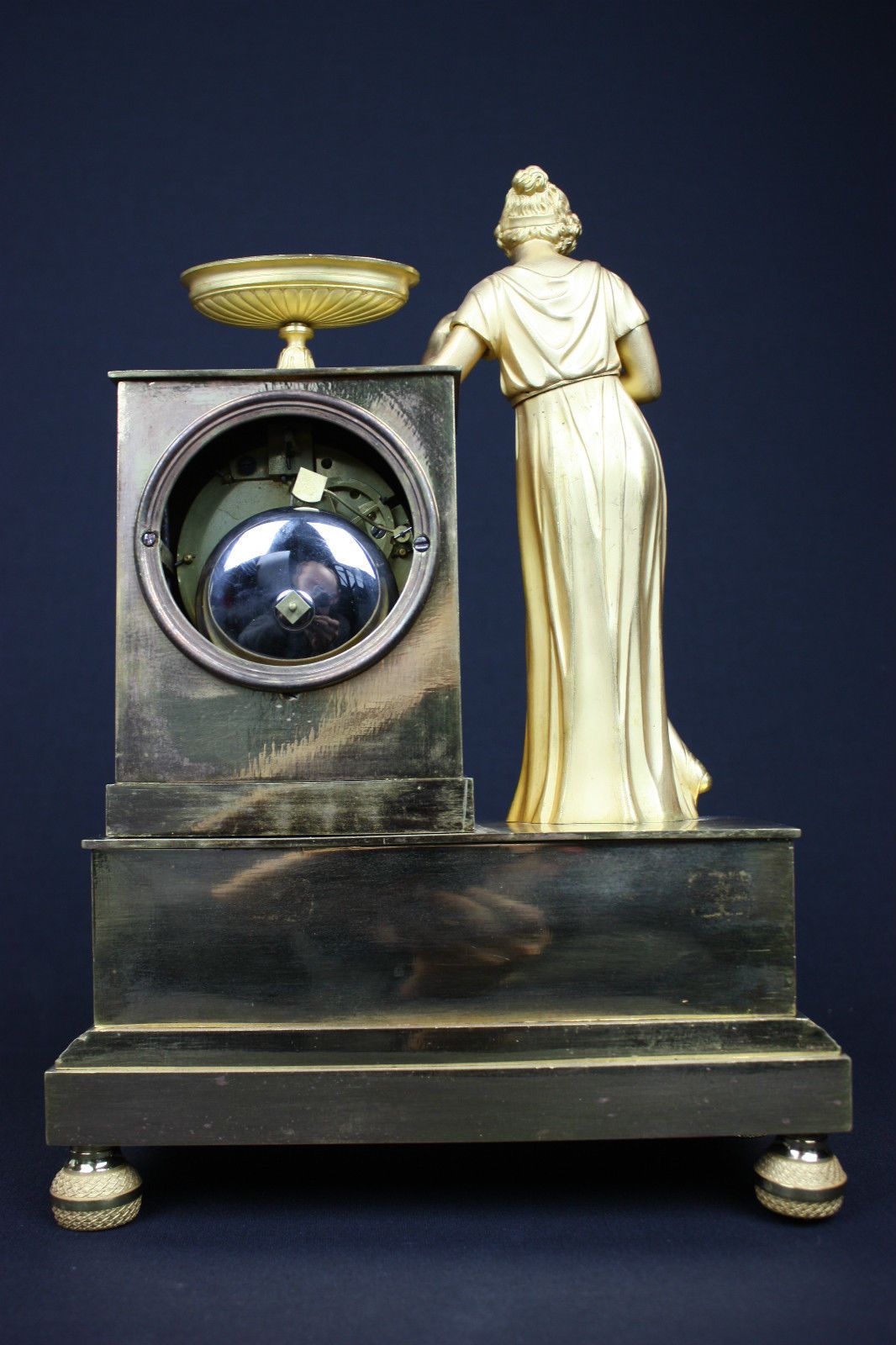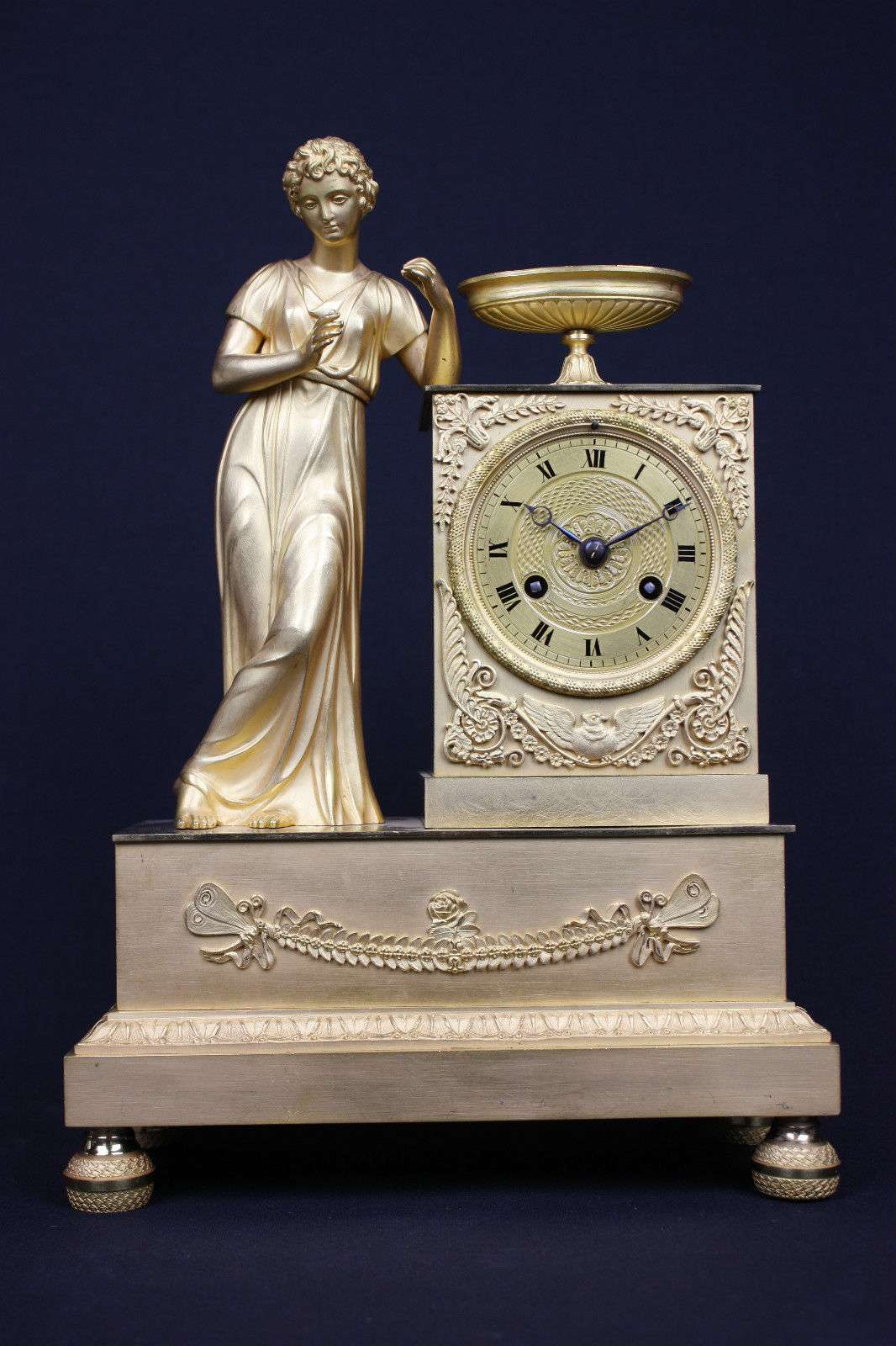 Very nice parisian pendulum from fire gilt bronze epoque "Restauration" 1818 Allegory of Wisdom on the finely chiseled feet resting the two-piece socket defined by a acanthus leaf strip is separated, the upper part with a garland adorned which is held by 2 butterflies in the middle is located a rose. On the base of the rectangular body builds on that with numerous floral appliques(garlands, plametten) showcases beneath the dial there is an owl with outstretched wings as a symbol of wisdom, to the watch body is a bowl attached. To the left is a thoughtful-looking woman, unfortunately missing the pen in her left hand. The housing has been completely cleaned, it is in an age-appropriate condition. The likewise gilt, guilloche dial was of a dial painter completely (authentic !!!) repainted by hand. The fine parisian pendulum clockwork hook-lever and half hour (on locking plate) has been completely overtaken by the master clockmaker and runs about 14 days. The offer contains a suitable pendulum and 1 matching key.